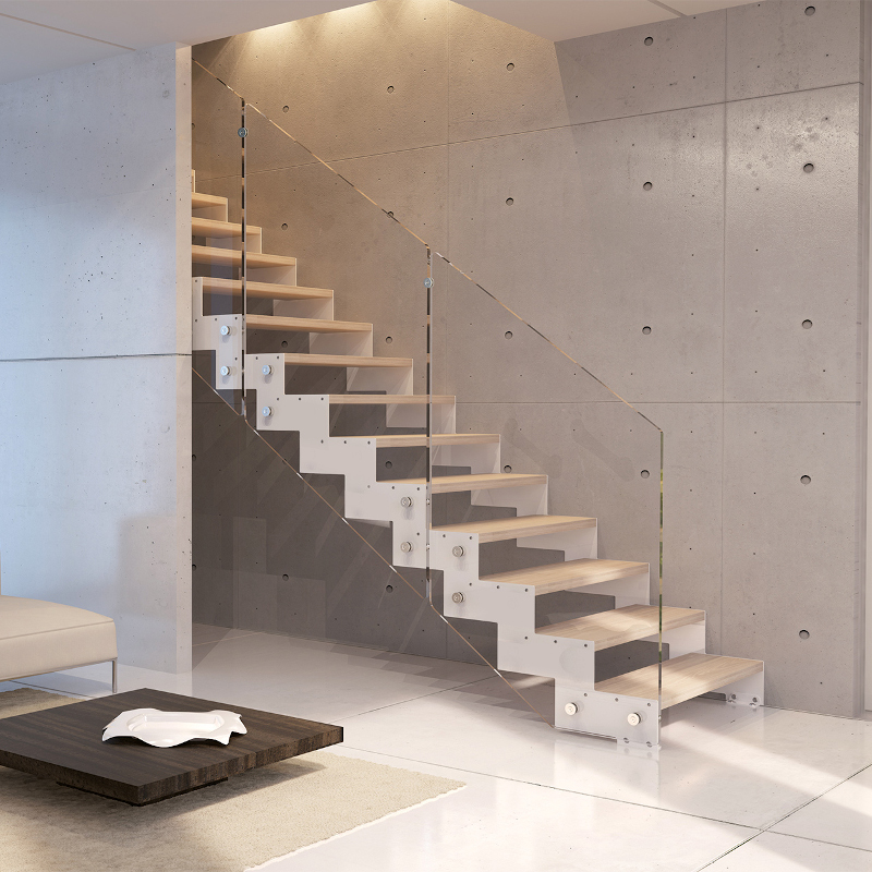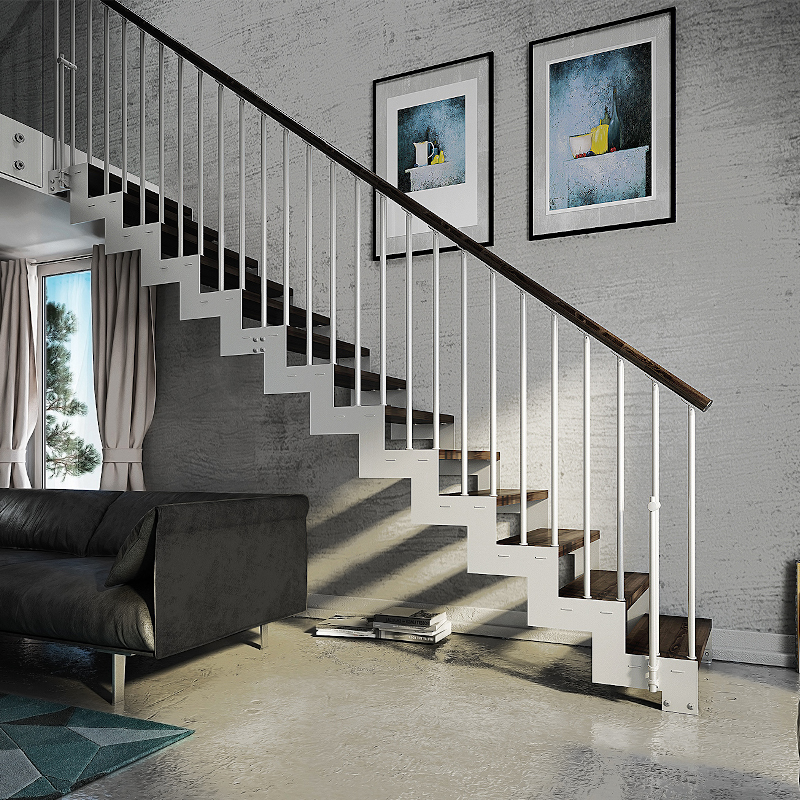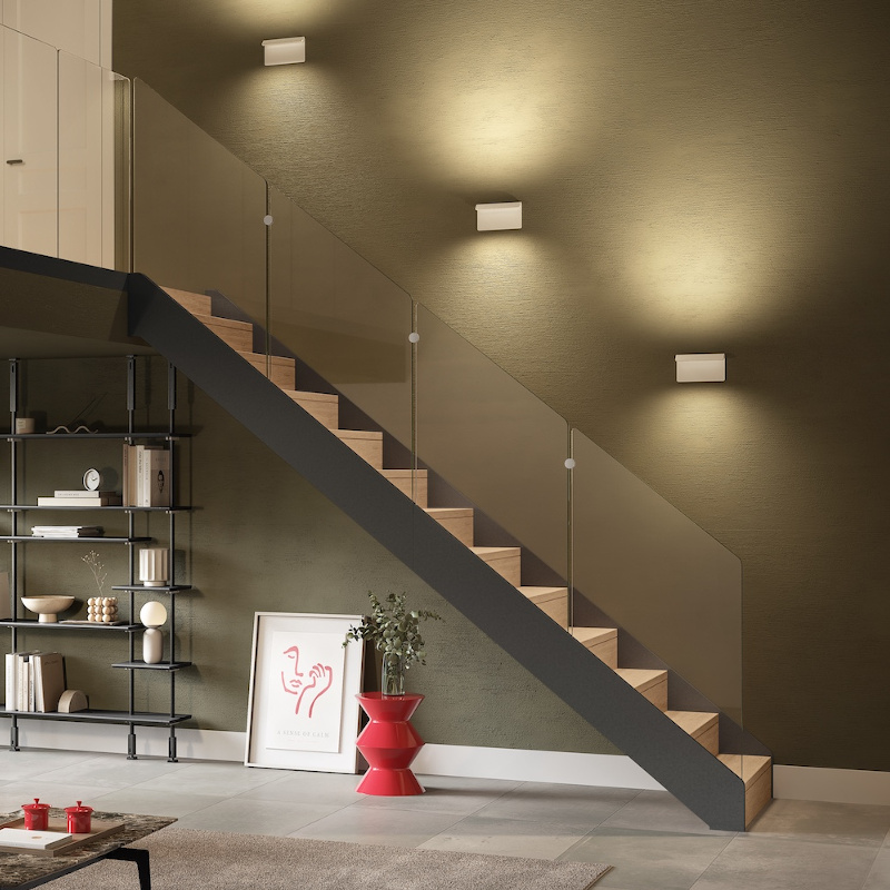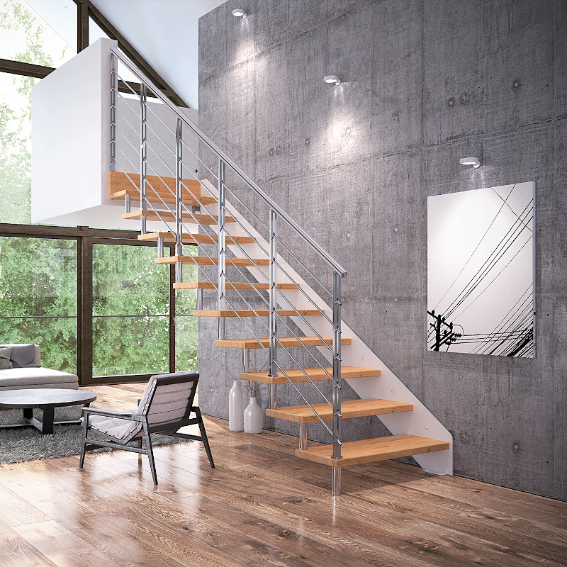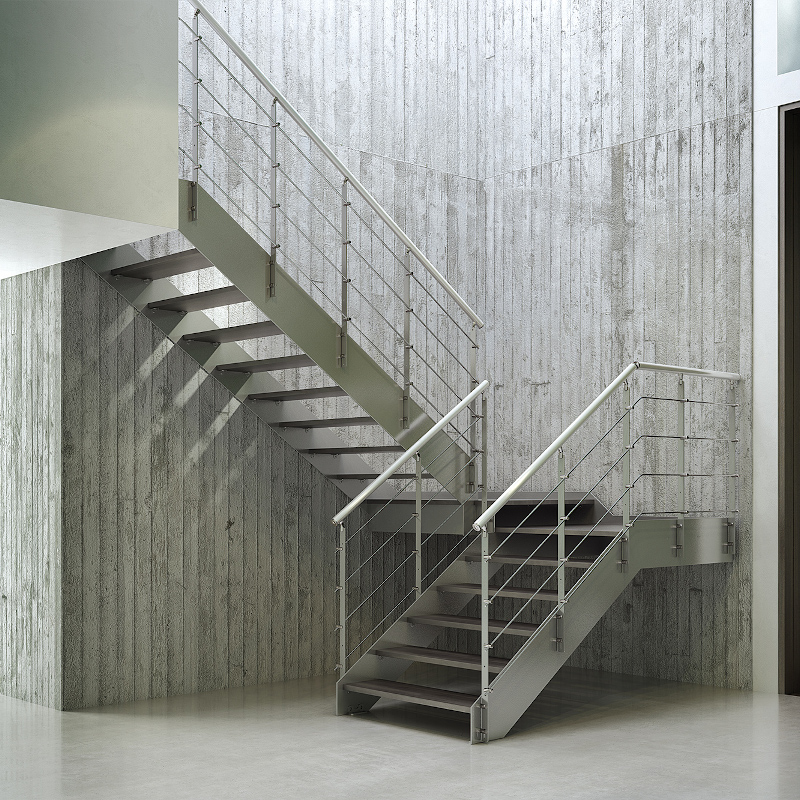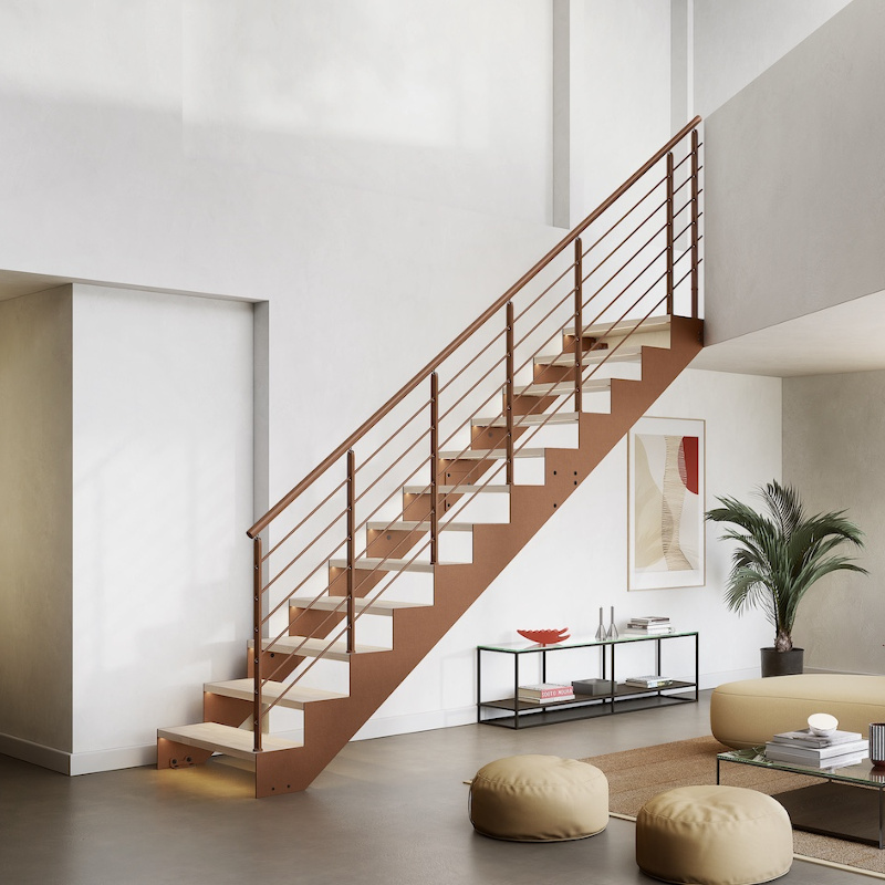 Tube, barrotes verticales de 25 mm de diámetro, pasamanos de madera en tramos o acero inoxidable satinado.
