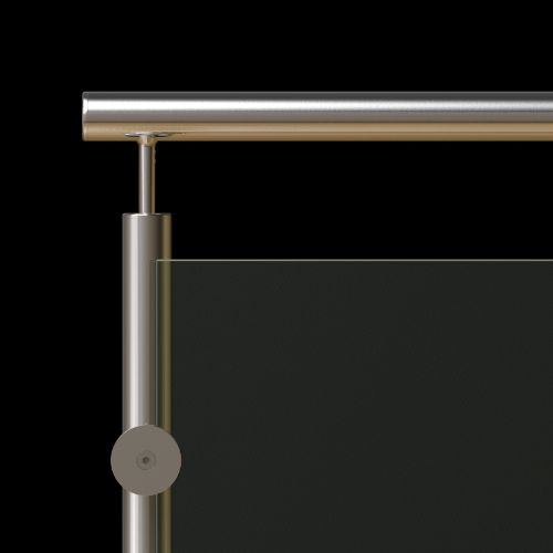 Barandilla realizada con montantes cilíndricos de 42 mm de acero inoxidable satinado o brillo, pasamanos de madera o acero inoxidable. Varillas de 12 mm o vidrio 5+5 mm.